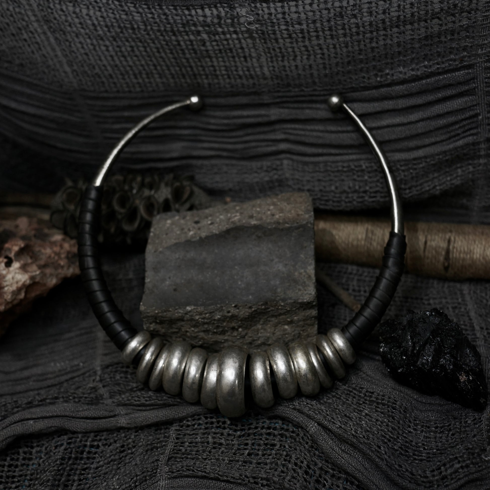 Tibetan tribal silver plated rings on a brass neck ring wrapped with recycled inner tube ~ rings can be taken off and individually worn on fingers.